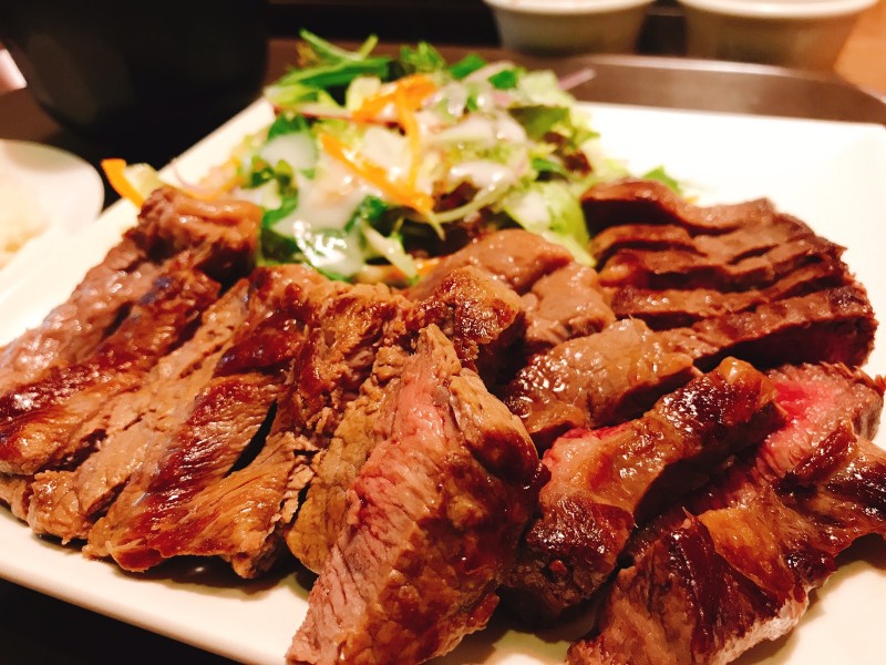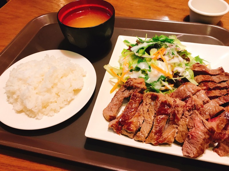 今回注文したのは「熟成牛ショルダーロースステーキ」の300gです。ご飯とお味噌汁とサラダは付いてきます。ご飯は注文時に大盛りかどうかを選べます(無料)が、おかわりは別途100円かかりますので、とりあえずご飯食べたい!って場合は大盛りで頼むといいと思います。(下の写真は普通量です)