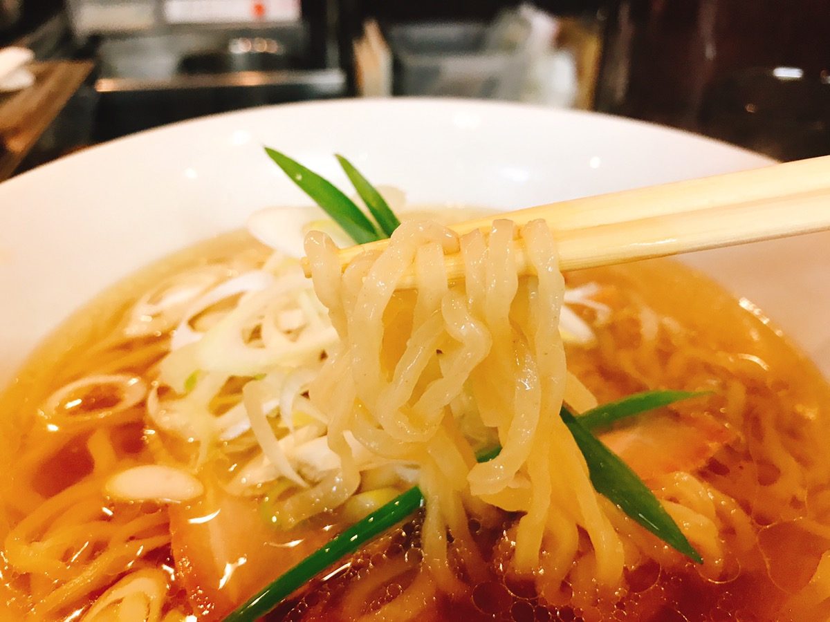 注文してからしばらくして塩ラーメンが着丼!!スープは透き通っていてきれい!麺は珍しく太い縮れ麺。写真通りなのですが具材はシンプルのネギとメンマとチャーシューのみ。