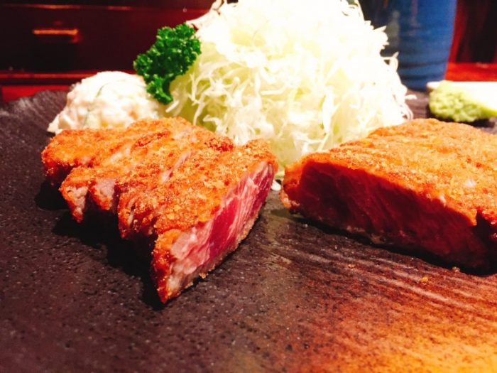 なんとここの牛かつ、60秒で揚げるそうです。衣の中はなんとレアレア!